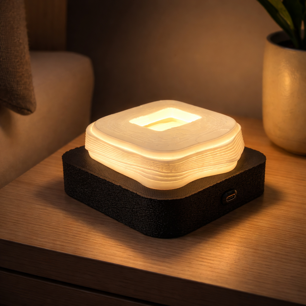 Socle en structure nid d’abeille, rendu graphique minimaliste.